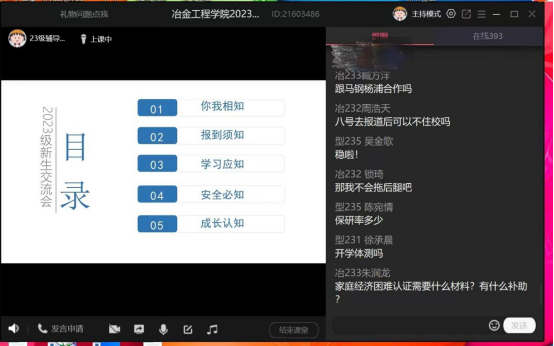 学生会成员、各班级班助、导生参加了本次线上会议,会议由2023级新生辅导员高倩莹主持。