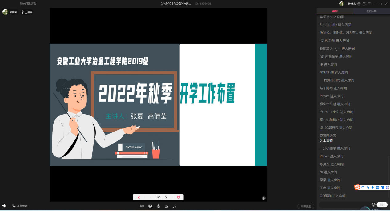 召开2019级本科生2022年度秋季开学工作布置线上年级会。会议由2019级辅导员张夏主持,全体2019级本科生参加。