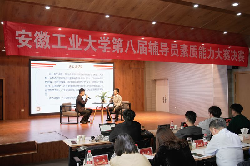 本次辅导员素质能力大赛分为初赛和决赛两个阶段。初赛阶段为笔试环节,学校全体一线专职辅导员参加;决赛阶段分为案例研讨、谈心谈话两个环节,案例研讨主要考察辅导员综合运用理论分析问题、研判问题、解决问题的能力,谈心谈话主要考察辅导员对学生特征、学生成长成才规律的了解把握程度,对学生的教育引导能力、解决理论困惑和实际问题的能力等。