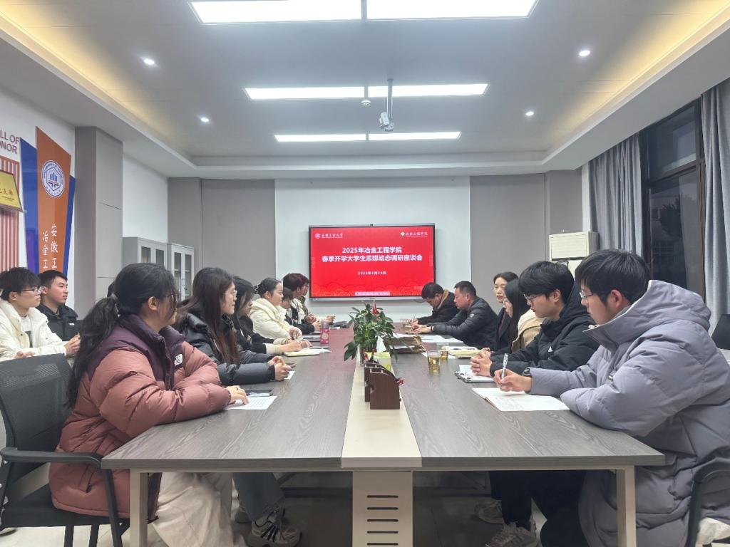在冶金楼南318会议室召开2024年春季学期学生思想动态调研会。院党委副书记、副院长朱艳飞,院团委书记张夏以及各年级学生代表参加本次会议。