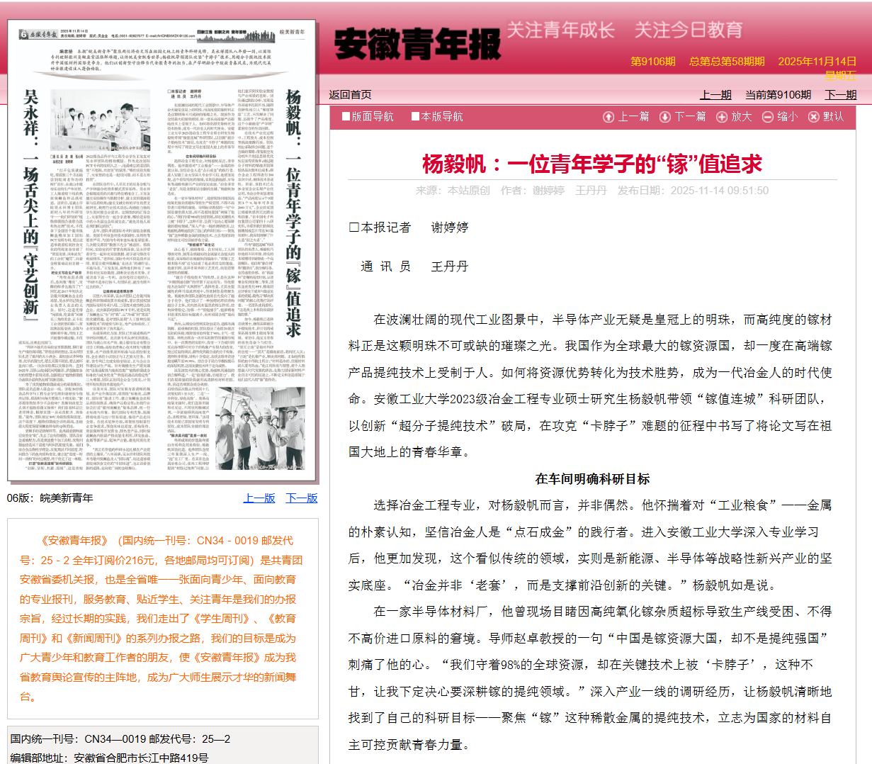 2025年11月14日,《安徽青年报》纸媒在“皖美新青年”专题中以《杨毅帆:一位青年学子的“镓”值追求》为题,专题报道欧美色情片2023级硕士研究生杨毅帆的科研实践事迹。