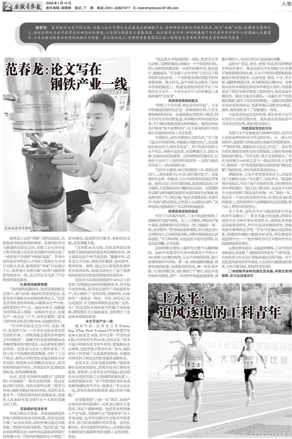 在安徽推进“三地一区”建设、加速产业绿色转型的浪潮中,范春龙以脚步丈量需求,用实干破解难题。他把青春理想融入产业发展,为钢铁行业“低碳革命”注入青春动能,也书写出新时代安徽青年服务家乡、助力国家战略的青春答卷。这份扎根实际、务实创新的科研初心,必将指引他在钢铁绿色低碳转型的道路上走得更稳、更远。