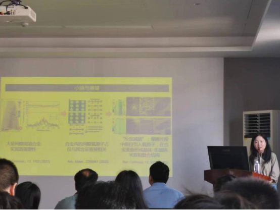 首先,刘畅教授做了题为“大量间隙固溶TiZrNb系多主元合金研发与原子尺度表征”的学术报告。报告会上,刘畅教授提出了一种通过大量间隙固溶实现超强高塑性的新合金设计策略,以TiZrNb多主元合金为例,在该合金中引入大量间隙氧原子(12at.%)实现了4.2GPa的超高屈服强度和优异的均匀塑性变形能力。随后,深入阐述了利用APT、4D-STEM等先进表征技术揭示其背后机理的过程。刘畅教授进一步介绍了其研发的一种具备超高耐磨性性能的合金,并详细分析了纳米结构多主元合金服役于摩擦环境时的结构演化机制。最后,刘畅教授回答了参与报告的师生提出的问题,并进行了热烈讨论。报告会取得圆满成功。