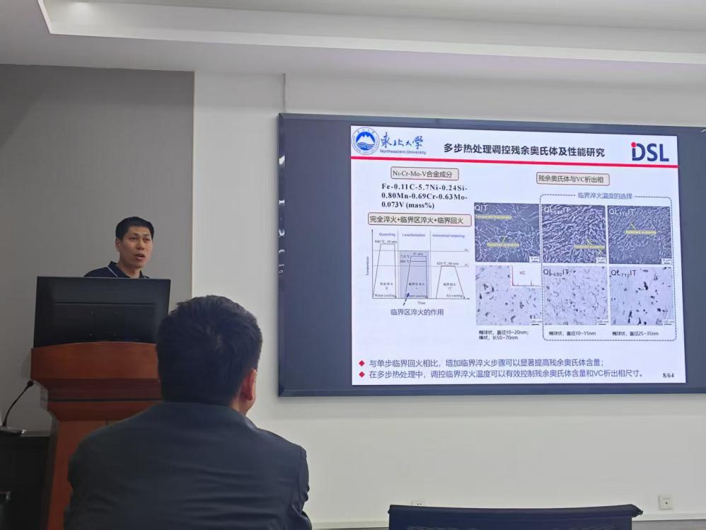报告中,胡军研究员系统介绍了团队在亚稳组织构筑、纳米析出相调控及强韧化机制方面的突破性进展。通过多尺度表征技术,揭示了特厚海工钢心部组织演化规律与性能关联机制,并展示了该技术在国内龙头钢企的产业化应用案例。此外,他还分享了团队在材料研发中的交叉创新经验,强调“基础研究-工艺开发-工程落地”全链条攻关的重要性。