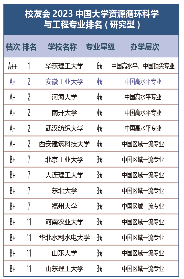 近期,在全国第三方大学评价机构艾瑞深校友会网正式公布的《2025校友会中国大学排名:高考志愿填报指南》中,我院资源循环科学与工程专业位居A+档次,连续三年排名全国第二。
