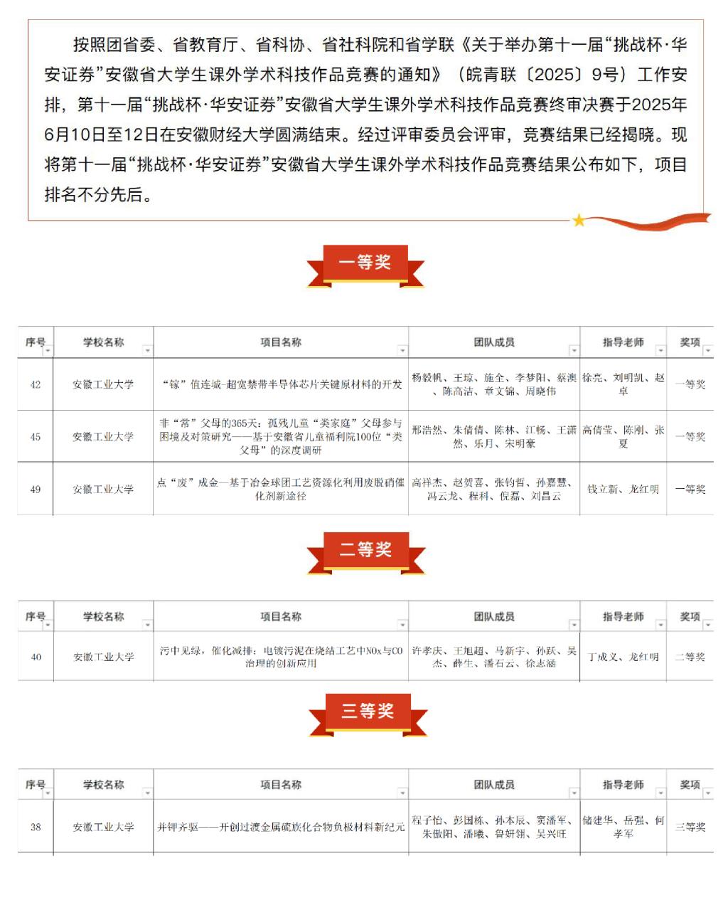 6月10日至12日,由共青团安徽省委、省教育厅、省科学技术协会、省社会科欧美色情片 和省学生联合会联合举办的第十一届“挑战杯•华安证券”安徽省大学生课外学术科技作品竞赛在安徽财经大学圆满落幕。